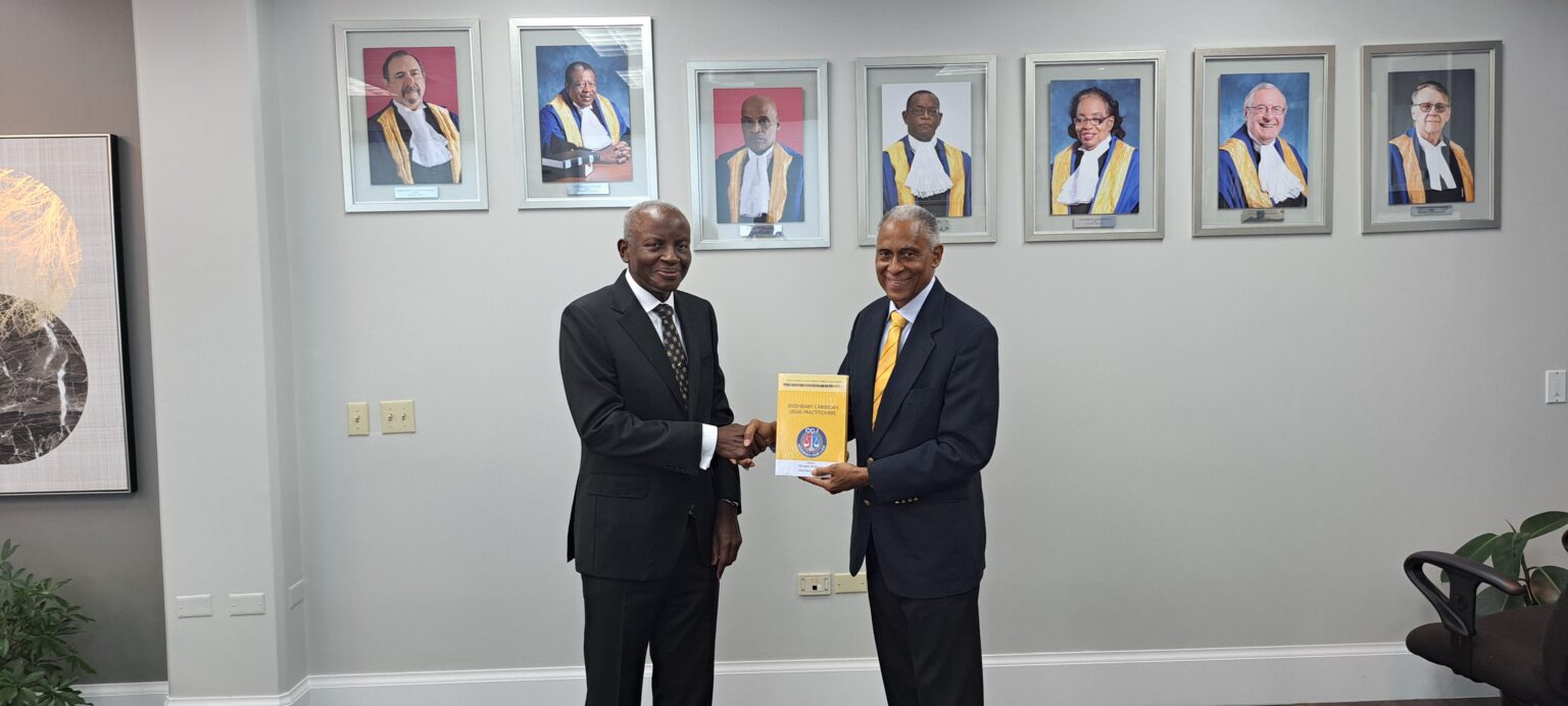 Dr Claude H. Denbow SC, one of the jurists recognised as a legendary Caribbean legal practitioner by the Academy in the third of its Eminent Caribbean Jurists series, paid the CCJ President, the Honourable Mr Justice Saunders, a visit at the Court on Tuesday, 4 June 2024. Also in attendance was the Honourable Mr Justice Winston Anderson, Chairman of the CCJ Academy for Law. In a brief presentation, President Saunders thanked Dr Denbow for his outstanding contribution to legal practice in the Commonwealth Caribbean before presenting him with a copy of the Legendary Caribbean Legal Practitioners. To purchase your copy, click here. See more pictures here.